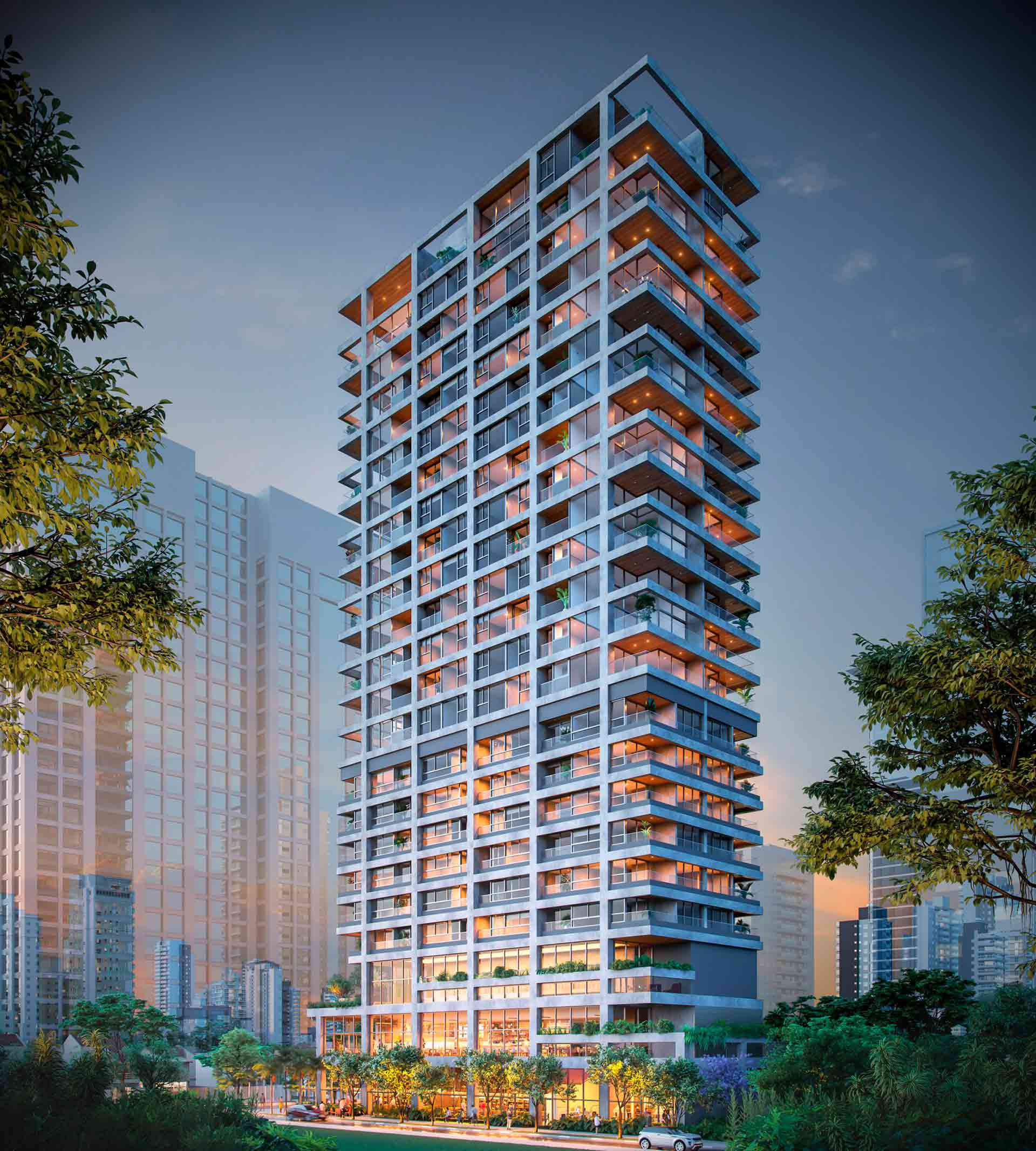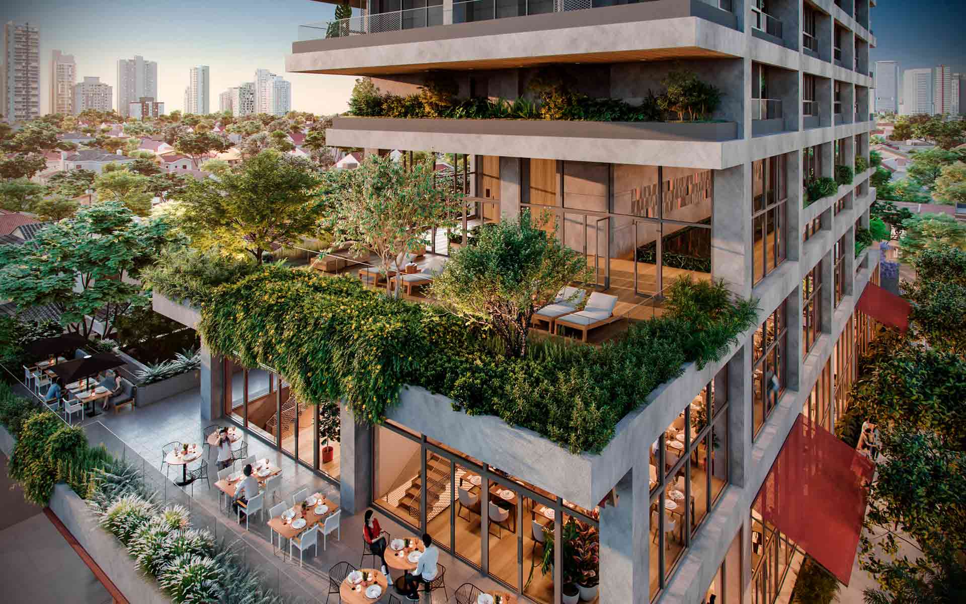 O projeto abraça a dinâmica viva dos arredores do terreno e do bairro, com lojas e restaurantes no térreo, uma área comum multifuncional e versátil.