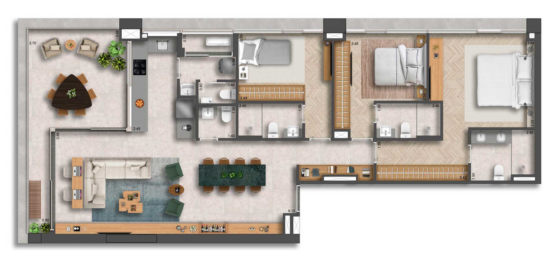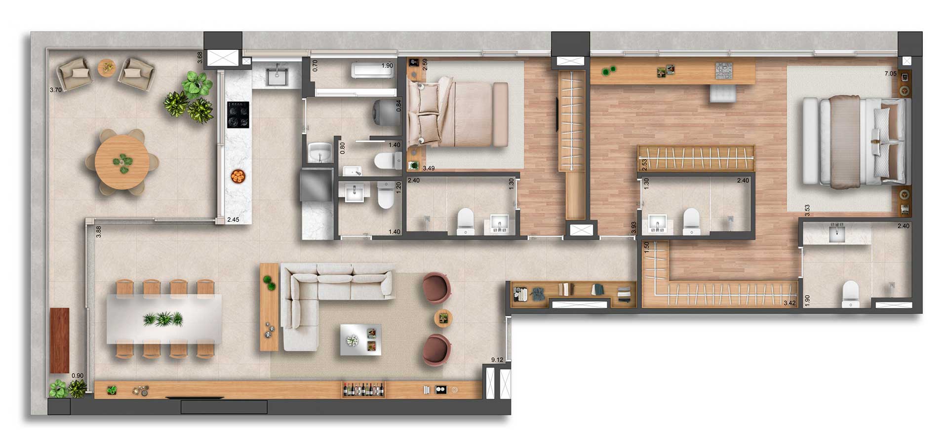 Com acabamentos refinados, seguindo o padrão Yuny, os apartamentos possuem plantas bem distribuídas para cada necessidade.