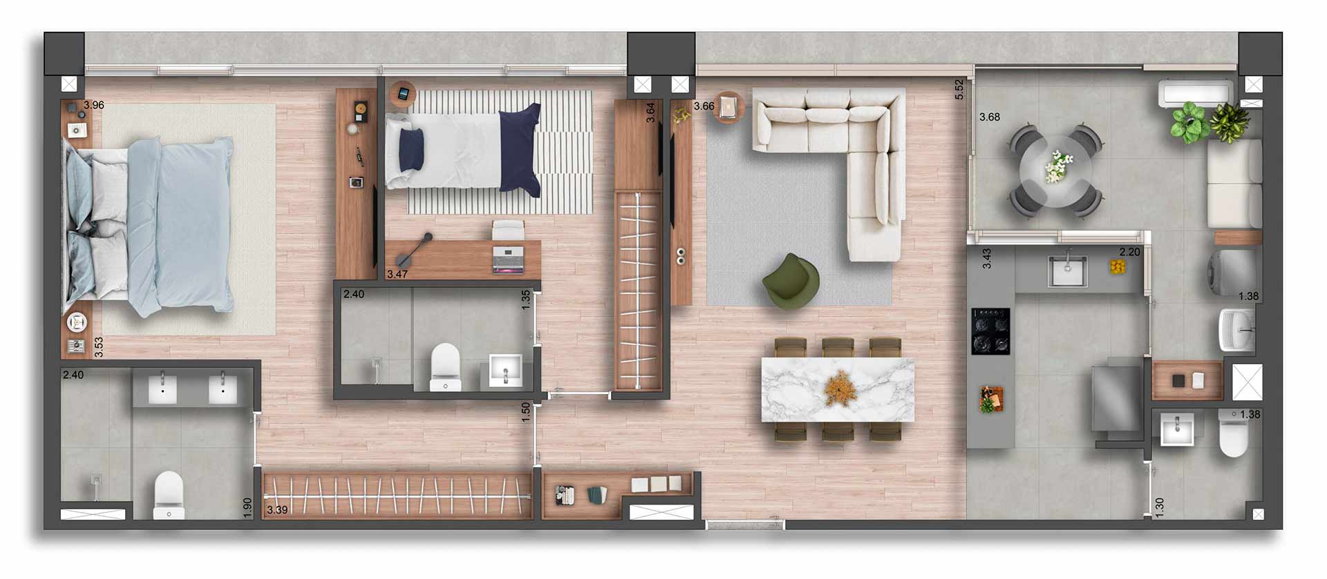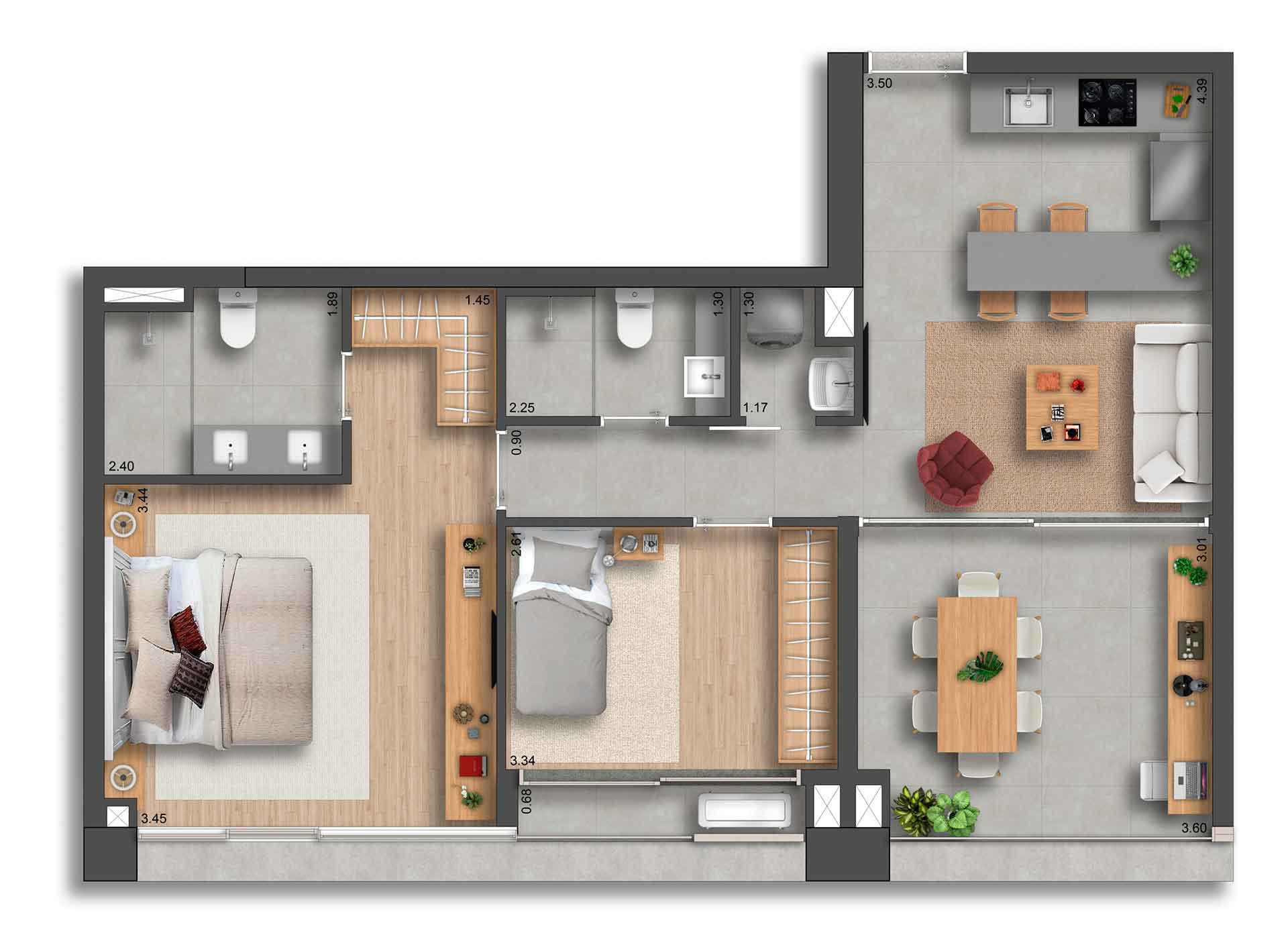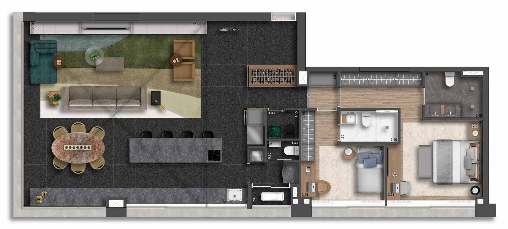 Yuny Gama Participações LTDA. inscrito no CNPJ/ME sob o nº 10.390.675/0001-48 e estabelecida na Avenida Pres. Juscelino Kubitschek, 2.041 (Torre D | 9º andar | Sala 13A) - Vila Nova Conceição - São Paulo (SP) - CEP 04543-011. O empreendimento somente será comercializado após o Registro do Memorial de Incorporação conforme a Lei nº 4.591/64. *Imagens meramente ilustrativas e informações preliminares sujeitas a alterações sem aviso prévio. Os móveis, objetos de decoração, revestimentos de pisos e paredes e a integração entre a sala e terraço são sugestões de decoração e não fazem parte integrante do contrato e do memorial descritivo. A unidade será entregue com o caixilho da sala conforme planta de contrato, e o detalhamento dos serviços, equipamentos e acabamentos que farão parte deste empreendimento constará no Memorial Descritivo e na Convenção de Condomínio. As plantas estão com medidas livres entre as paredes e estão sujeitas a alterações em decorrência dos acabamentos a serem utilizados. Projeto executivo em desenvolvimento, podendo sofrer alterações durante as compatibilizações técnicas. O porte da vegetação ilustrado nas imagens é da fase adulta. O paisagismo será entregue recém-plantado e conforme projeto e Memorial Descritivo.**Imagem meramente ilustrativa. Não será executada pela incorporadora. O comprador somente poderá executar a junção de unidades após o recebimento das chaves. Responsabilidade exclusiva do comprador pelas aprovações e despesas junto aos órgão competentes.***Não será executada pela incorporadora. O comprador somente poderá executar a junção de unidades após o recebimento das chaves. Responsabilidade exclusiva do comprador pelas aprovações e despesas junto aos órgão competentes.