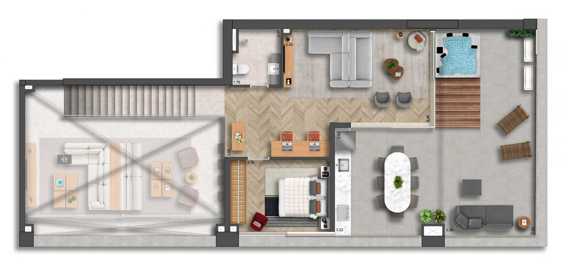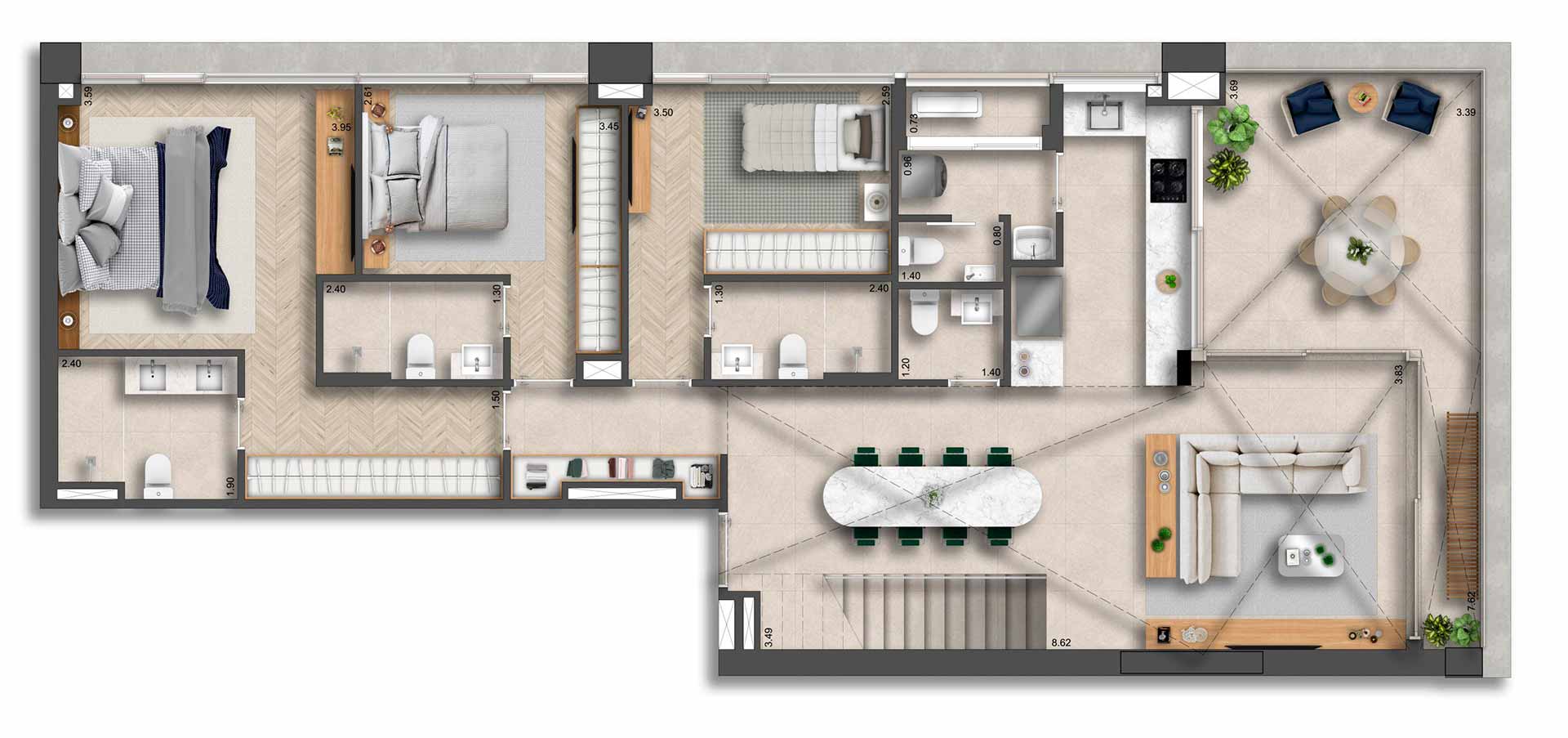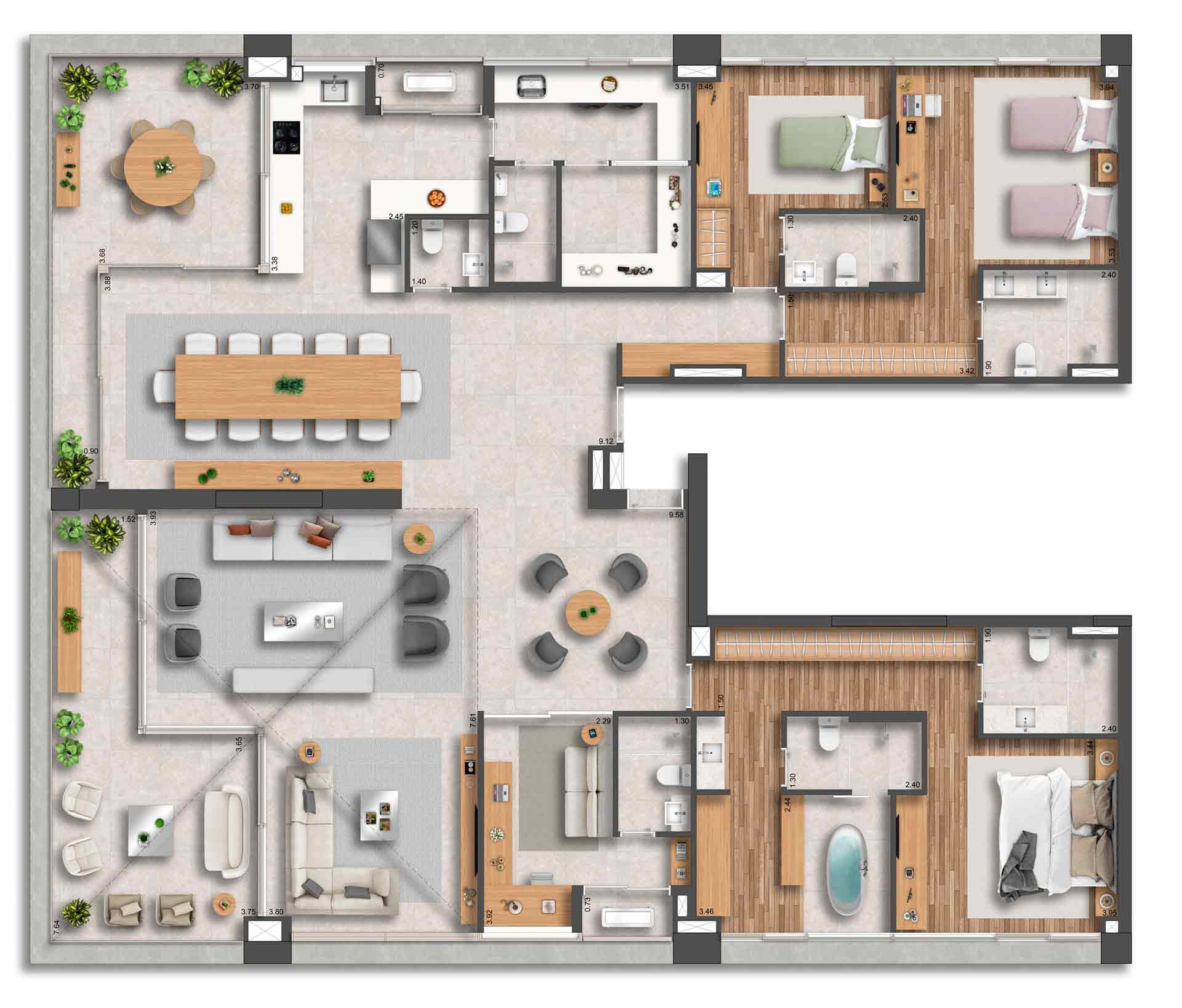 Yuny Gama Participações LTDA. inscrito no CNPJ/ME sob o nº 10.390.675/0001-48 e estabelecida na Avenida Pres. Juscelino Kubitschek, 2.041 (Torre D | 9º andar | Sala 13A) - Vila Nova Conceição - São Paulo (SP) - CEP 04543-011. O empreendimento somente será comercializado após o Registro do Memorial de Incorporação conforme a Lei nº 4.591/64. *Imagens meramente ilustrativas e informações preliminares sujeitas a alterações sem aviso prévio. Os móveis, objetos de decoração, revestimentos de pisos e paredes e a integração entre a sala e terraço são sugestões de decoração e não fazem parte integrante do contrato e do memorial descritivo. A unidade será entregue com o caixilho da sala conforme planta de contrato, e o detalhamento dos serviços, equipamentos e acabamentos que farão parte deste empreendimento constará no Memorial Descritivo e na Convenção de Condomínio. As plantas estão com medidas livres entre as paredes e estão sujeitas a alterações em decorrência dos acabamentos a serem utilizados. Projeto executivo em desenvolvimento, podendo sofrer alterações durante as compatibilizações técnicas. O porte da vegetação ilustrado nas imagens é da fase adulta. O paisagismo será entregue recém-plantado e conforme projeto e Memorial Descritivo.**Imagem meramente ilustrativa. Não será executada pela incorporadora. O comprador somente poderá executar a junção de unidades após o recebimento das chaves. Responsabilidade exclusiva do comprador pelas aprovações e despesas junto aos órgão competentes.***Não será executada pela incorporadora. O comprador somente poderá executar a junção de unidades após o recebimento das chaves. Responsabilidade exclusiva do comprador pelas aprovações e despesas junto aos órgão competentes.