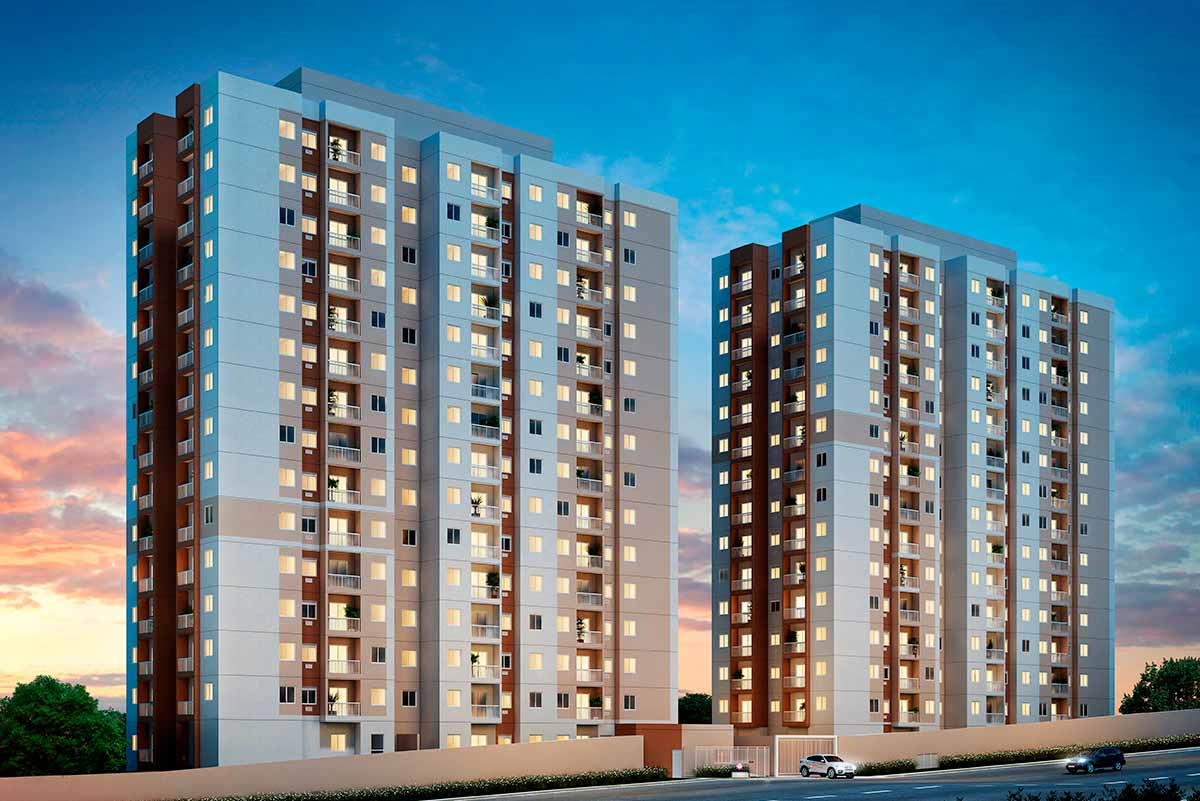 UNIDADES RESIDENCIAIS 264 sendo: 132 unidades - 45 m² - 2 dorms. com terraço l 132 unidades - 56 m² - 2 dorms. com suíte e terraço. Número de vagas: 187 vagas + 2 PCD