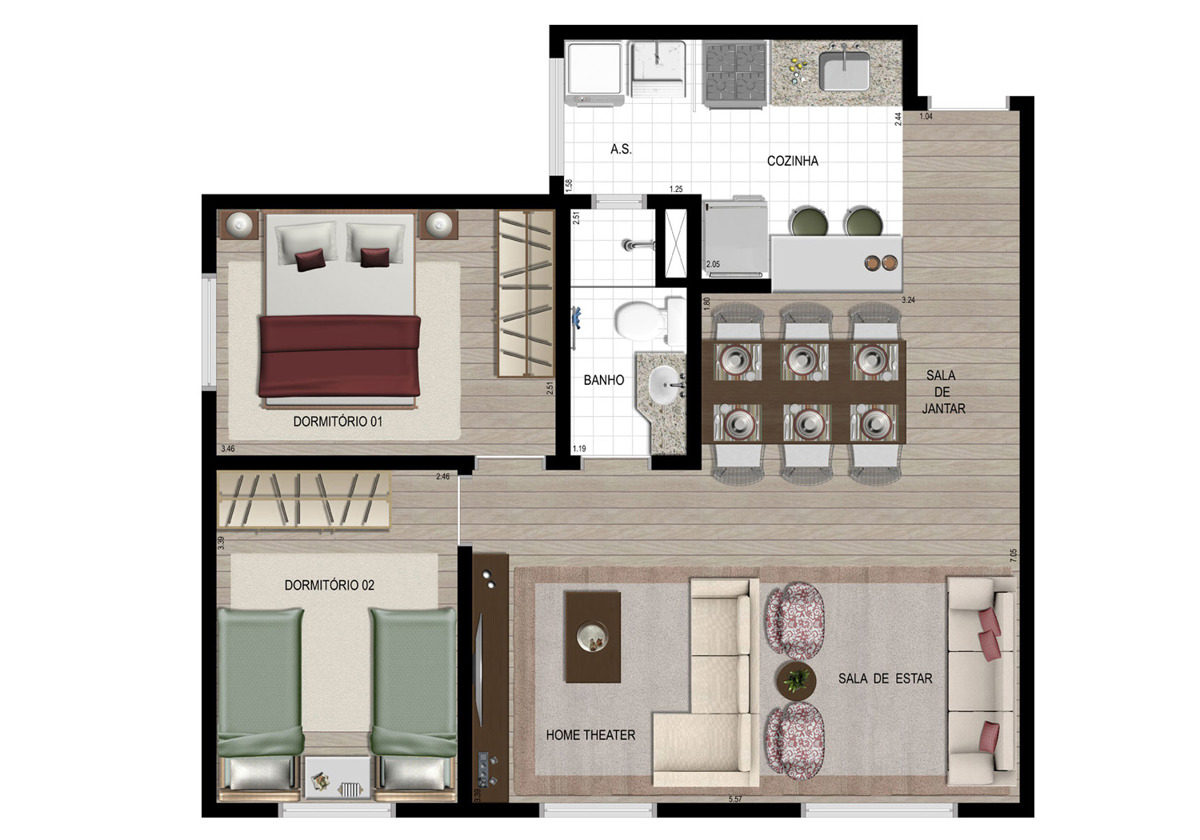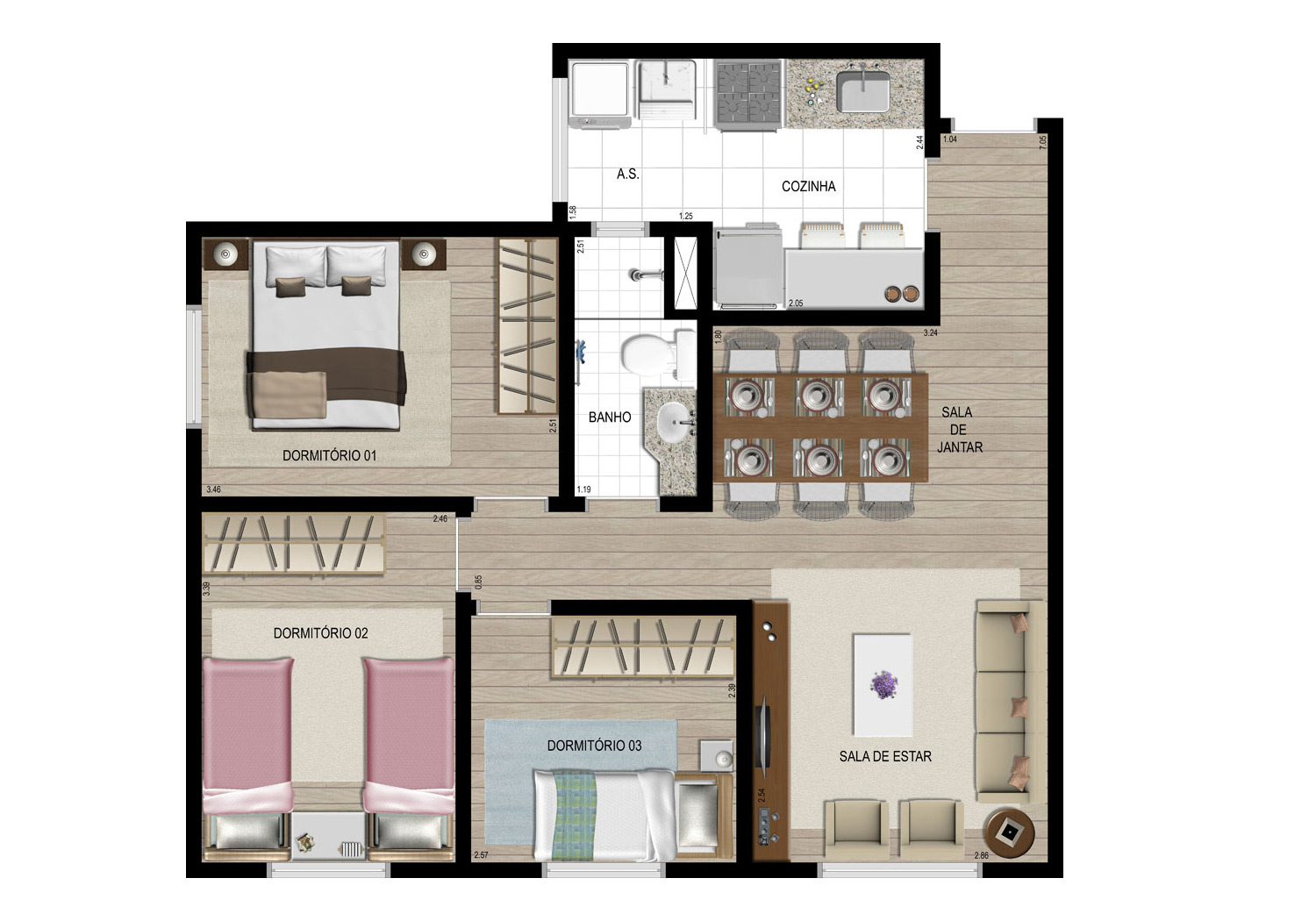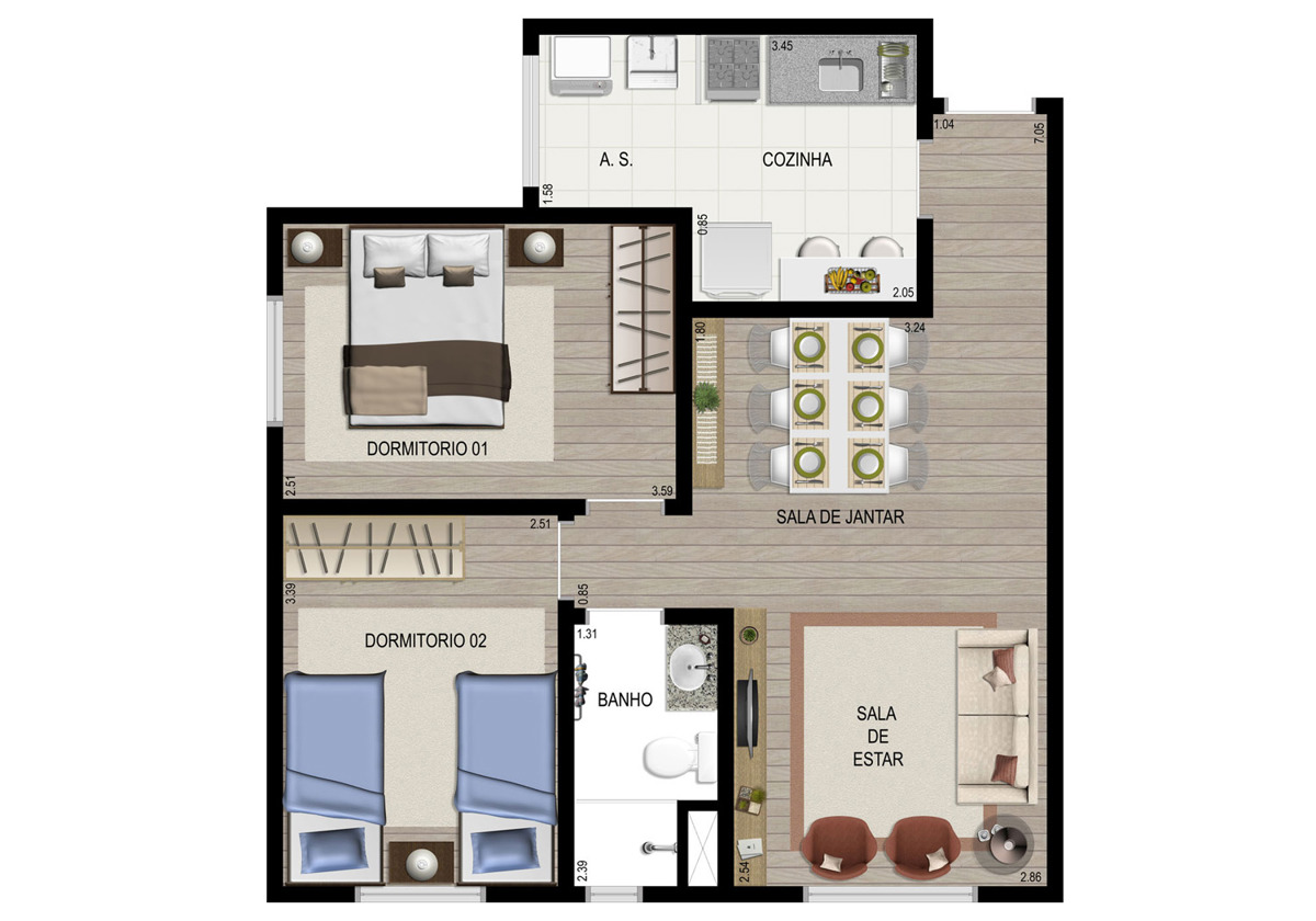 Tipologia: 3 dorms. (61 m²), 2 dorms. (53 m²)