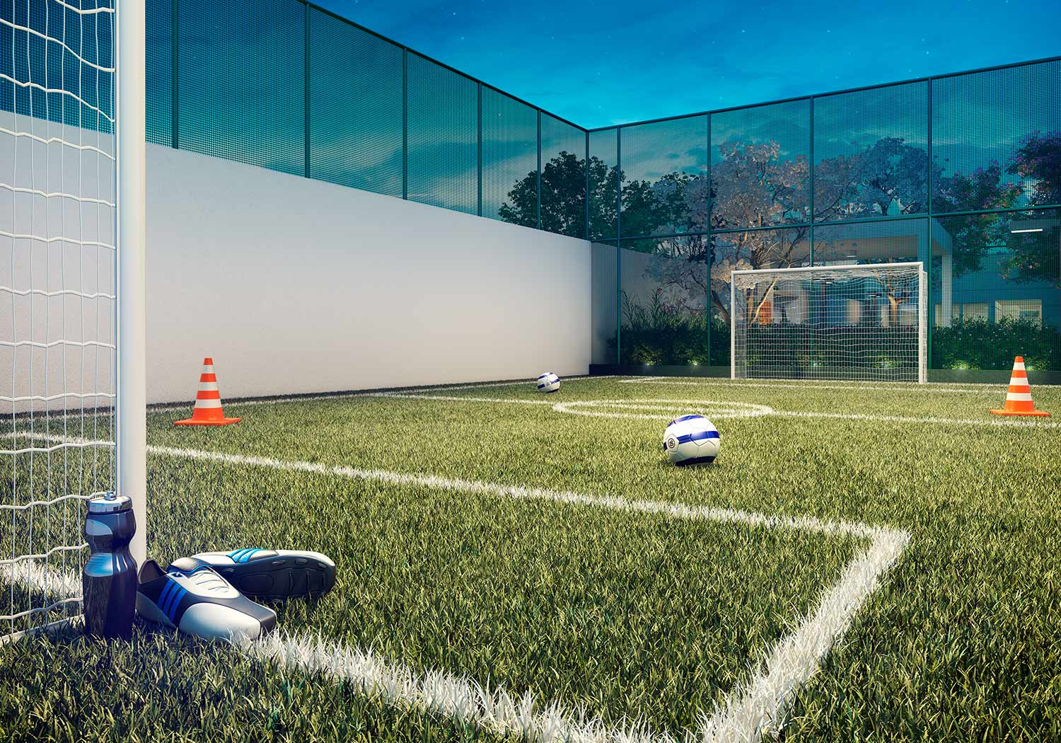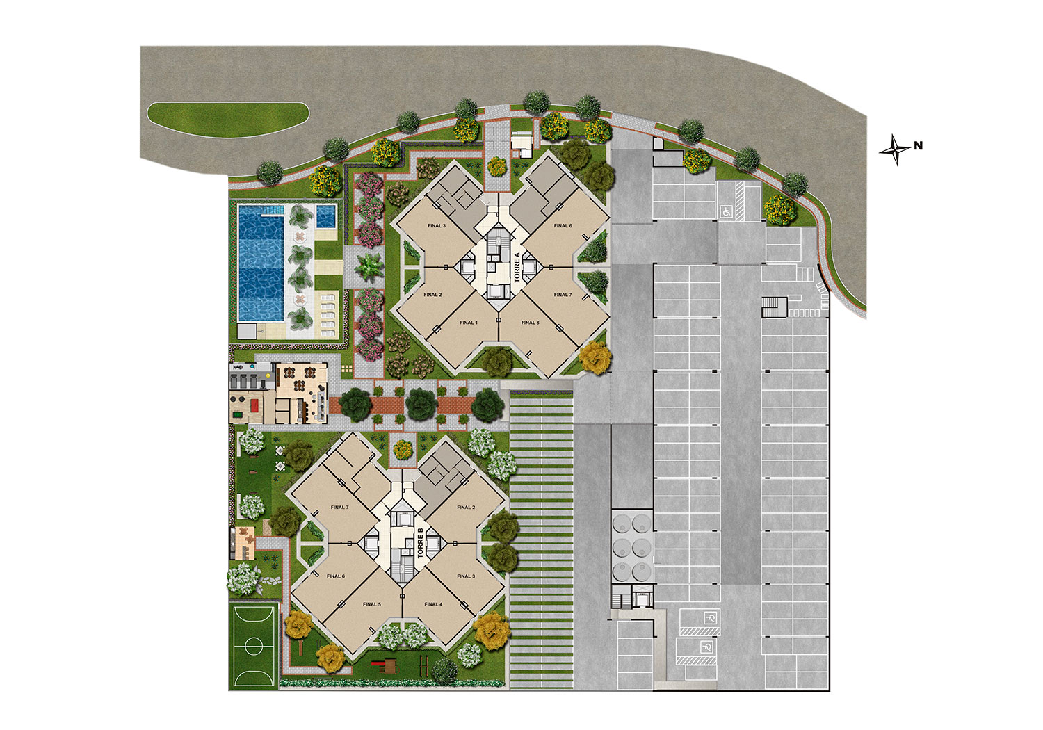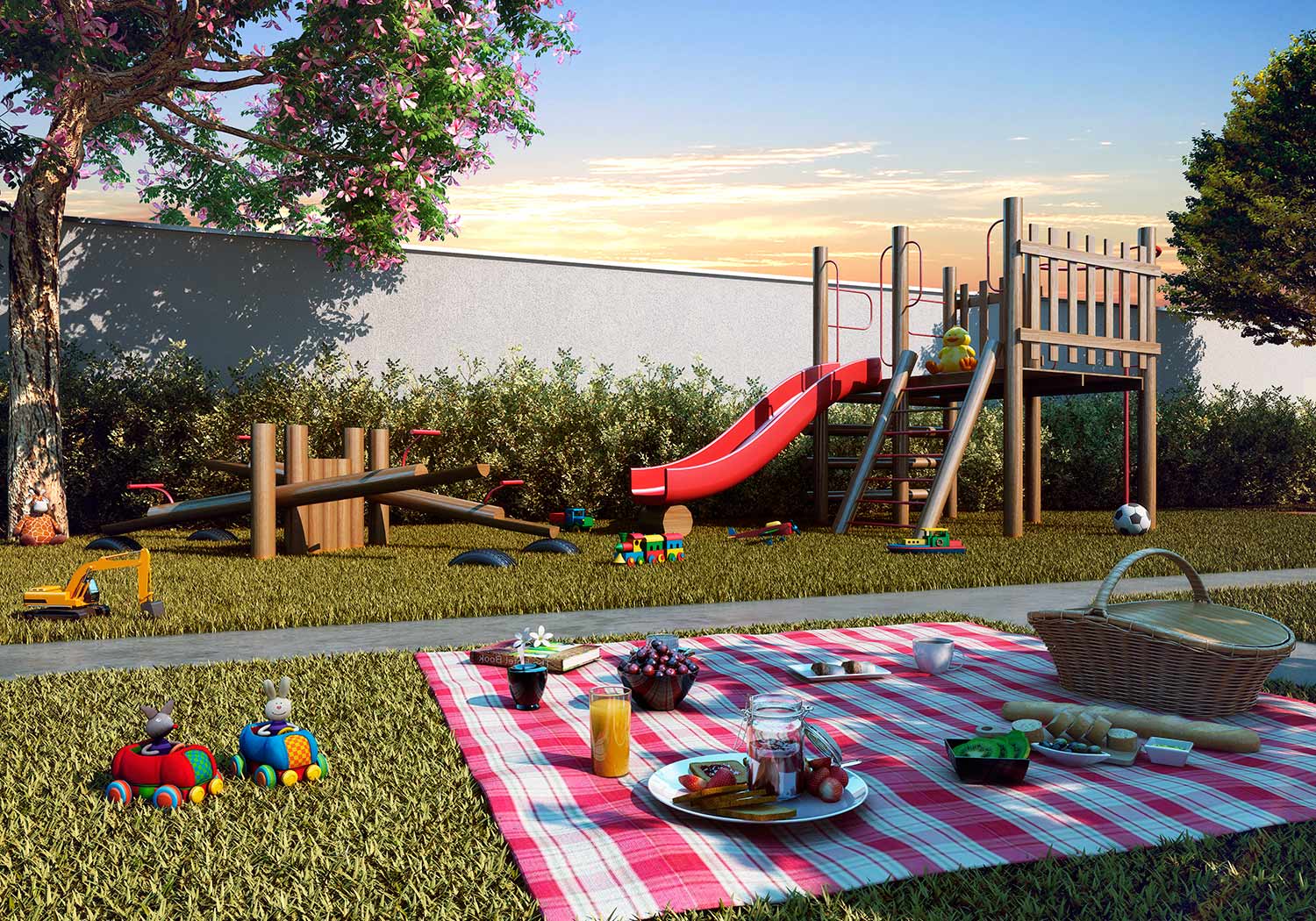 Lazer: Salão de festas / Fitness / Sala de jogos / Piscina adulto / Piscina infantil / Play baby / Playground / Quadra gramada / Churrasqueira / Redário / Praça dos jogos