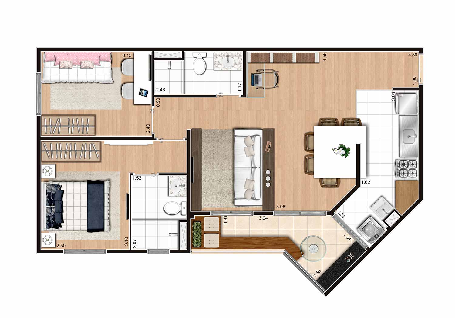 Tipologia: 2 dorms. com suíte (55 m²) 3 dorms. com suíte (65 m²)