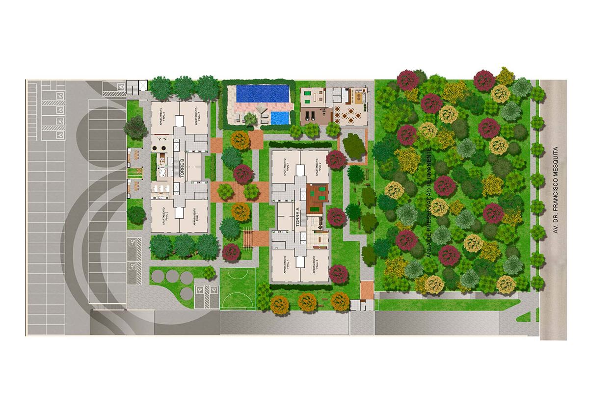 Lazer: Salão de Festas / Sala de Ginástica / Salão de Jogos / Lavanderia / Brinquedoteca / Playground / Praça das Mamães / Espaço Gourmet / Mini Bosque / Piscina Adulto / Piscina Infantil / Redário / Fitness Externo