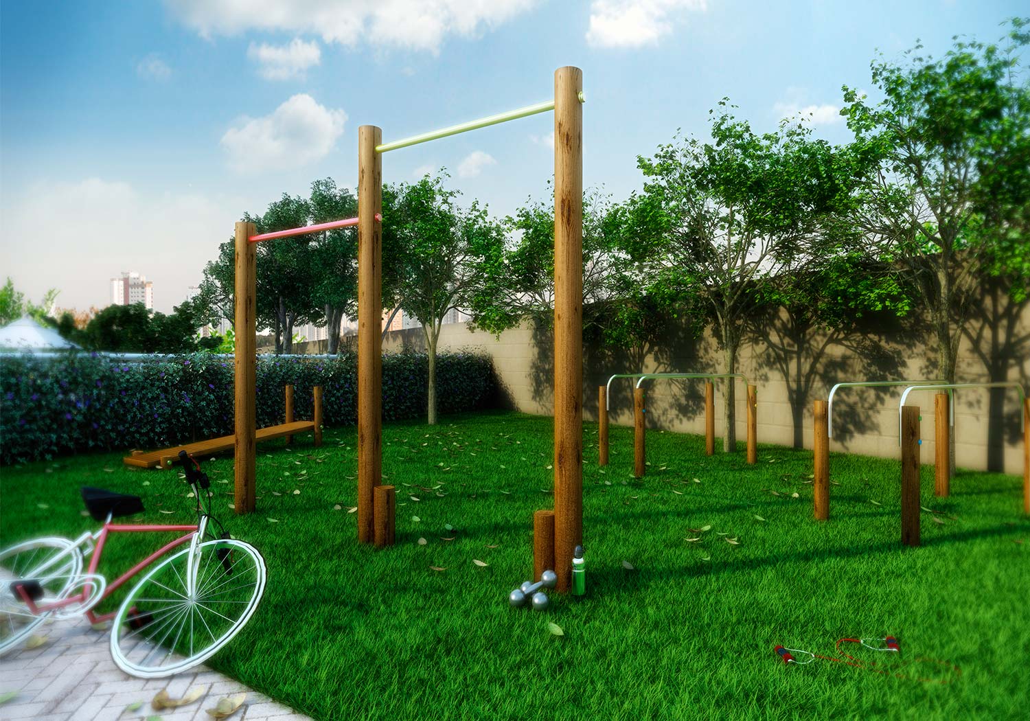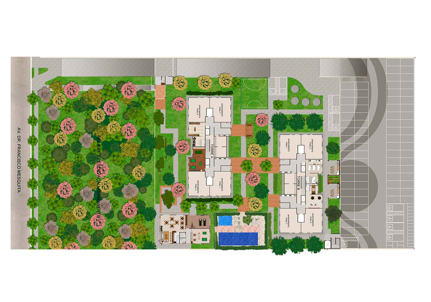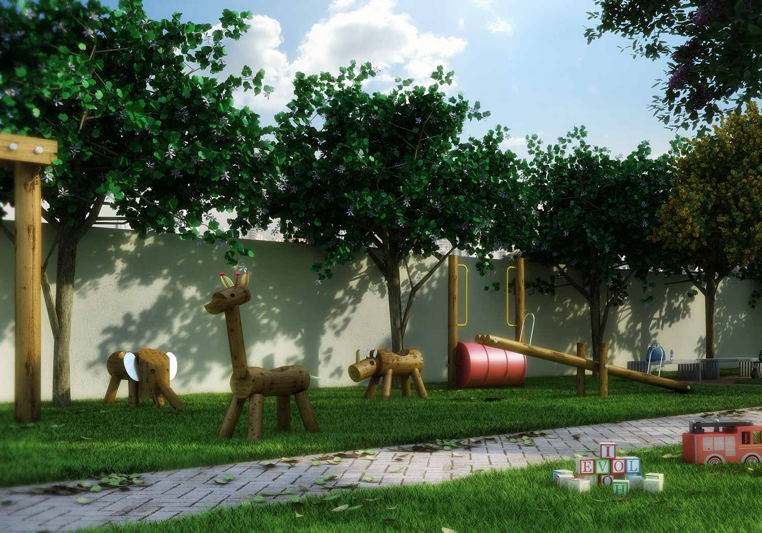 Lazer: Salão de festas / Sala de Ginástica / Sala de Jogos / Lavanderia / Office / Brinquedoteca / Playground / Praça das mamães / Churrasqueira / Mini bosque / Piscina Adulto / Piscina Infantil / Redário / Fitness Externo