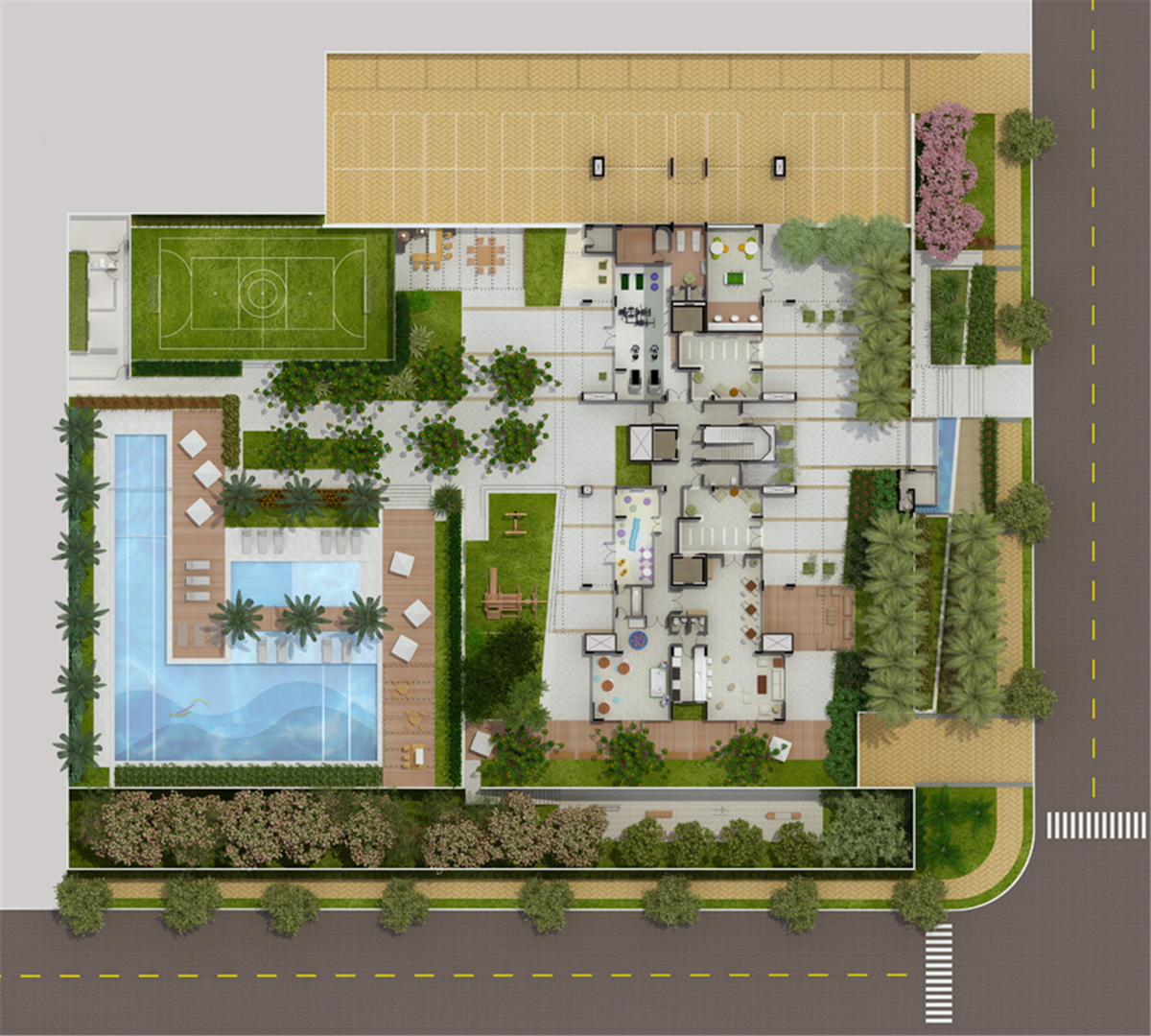 Lazer: Piscina adulto, piscina infantil, Quadra poliesportiva, Playground, Fitness, Brinquedoteca, Salão de jogos, Saão de festas adulto e infantil, Churrasqueira e Spa