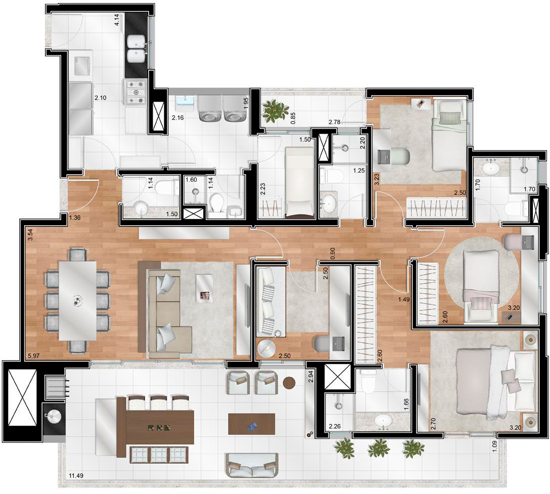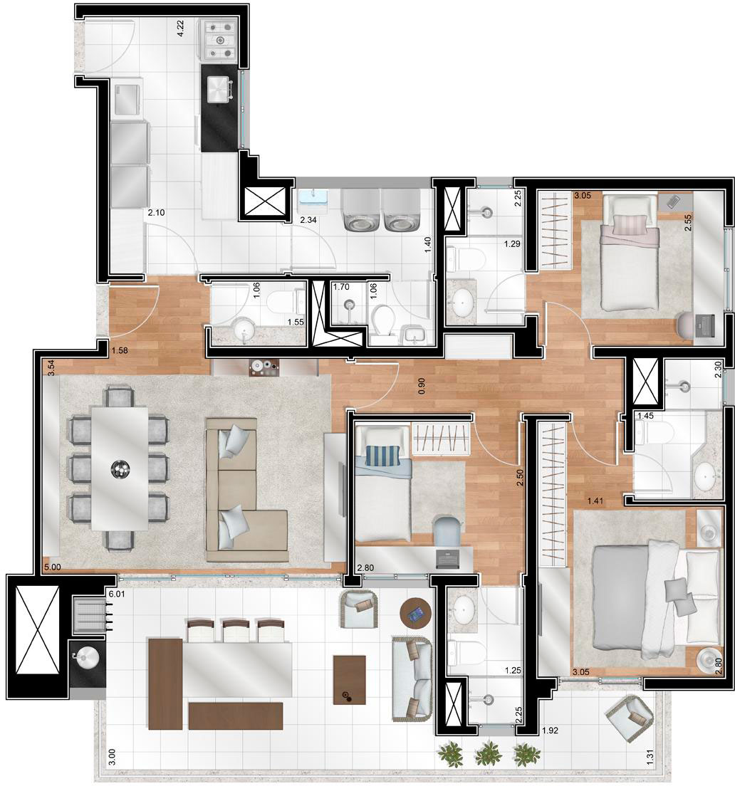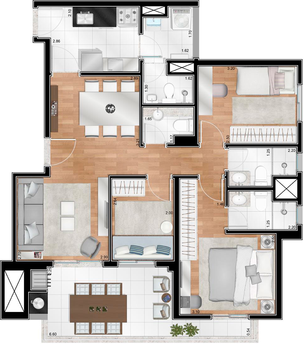 Apartamentos: Torre Solário - 145m² - 4 Dormitórios (2 suítes) / Torre Jardins - 117m² - 3 suítes / Torre Átrio - 88m² - 3 dormitórios (1 suíte)